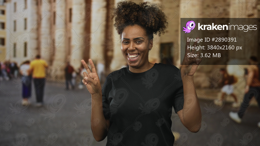 Woman holds up two peace signs with both hands on an old town street in front of a historic building; joy travel memory.
