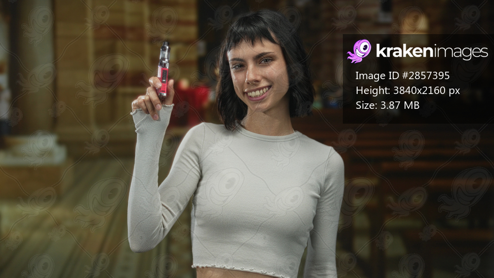 Woman holds vape in church building, smiling with raised arm to display the vaporizer; spiritual rebellion.