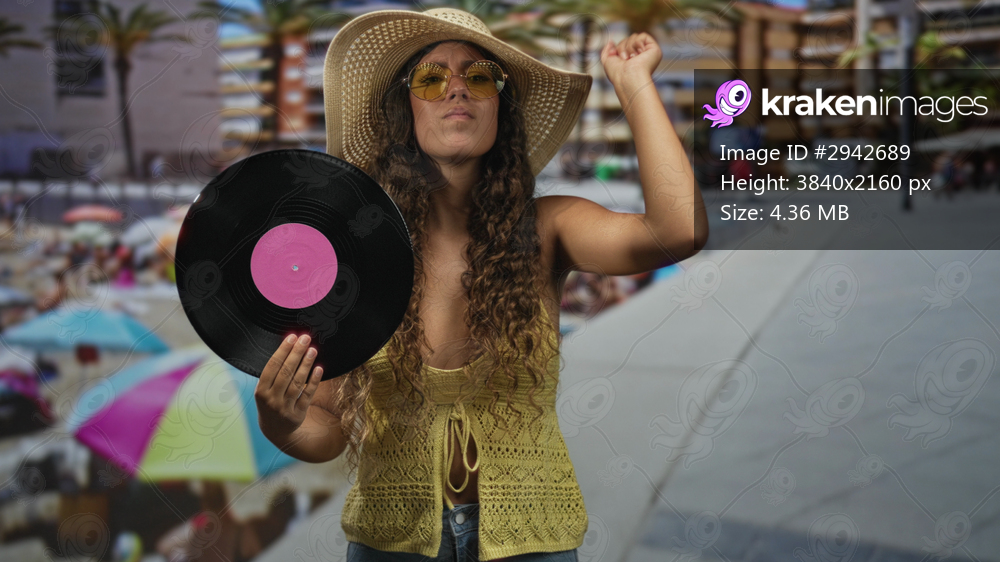 Woman holds vinyl record at chest and raises fist on a crowded beachside street near umbrellas and buildings; playful summer celebration.