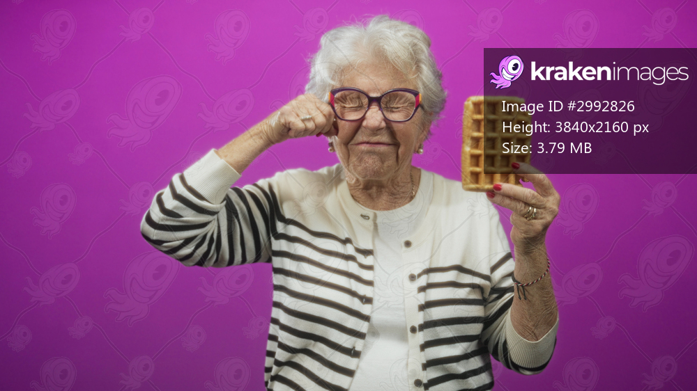 Woman holds waffle with one hand while rubbing her eye with the other in a magenta studio backdrop; playful mischief.