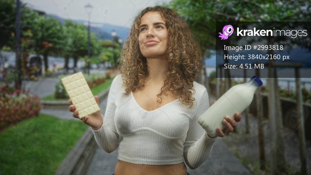 Woman holds white chocolate bar in one hand and milk bottle in the other, looks up on a street promenade; choice contemplation.