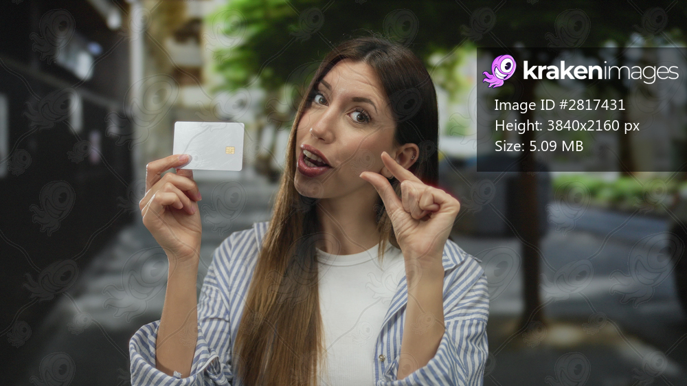 Woman holds white credit card with chip and pinches fingers to show small size in street; budget confidence.