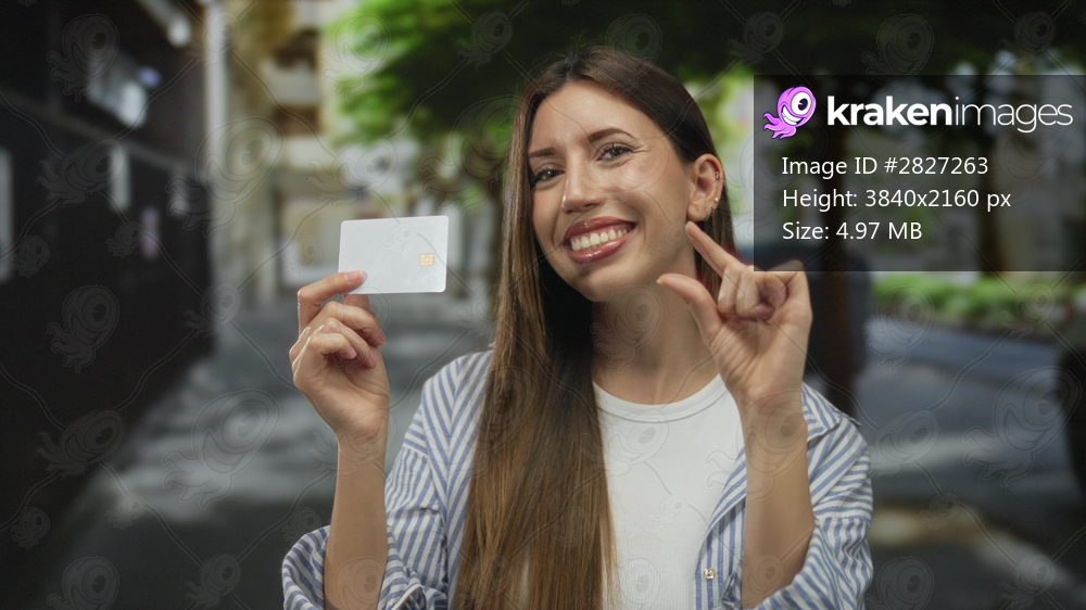 Woman holds white credit card with chip and pinches fingers to show small size in street; budget confidence.