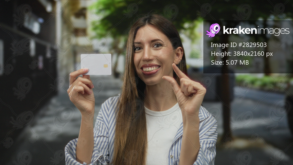 Woman holds white credit card with chip and pinches fingers to show small size in street; budget confidence.