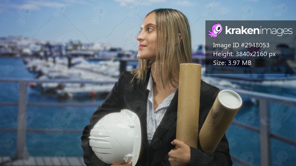 Woman holds white hard hat and rolled blueprint tubes on a marina pier with docked boats and ferry nearby; confidence leadership.