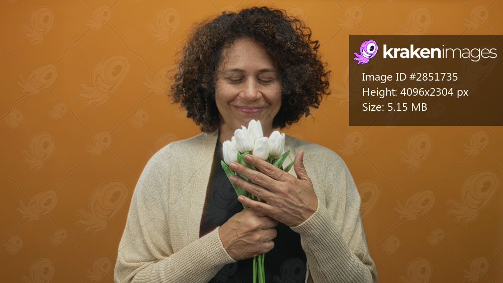 Woman holds white tulips close to chest with gentle hands visible in orange studio setting; gratitude.