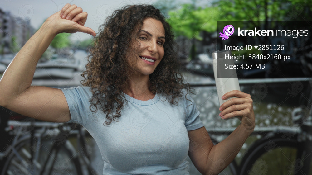 Woman holds white water bottle, smiles and points thumb by sunny urban canal; self confidence.
