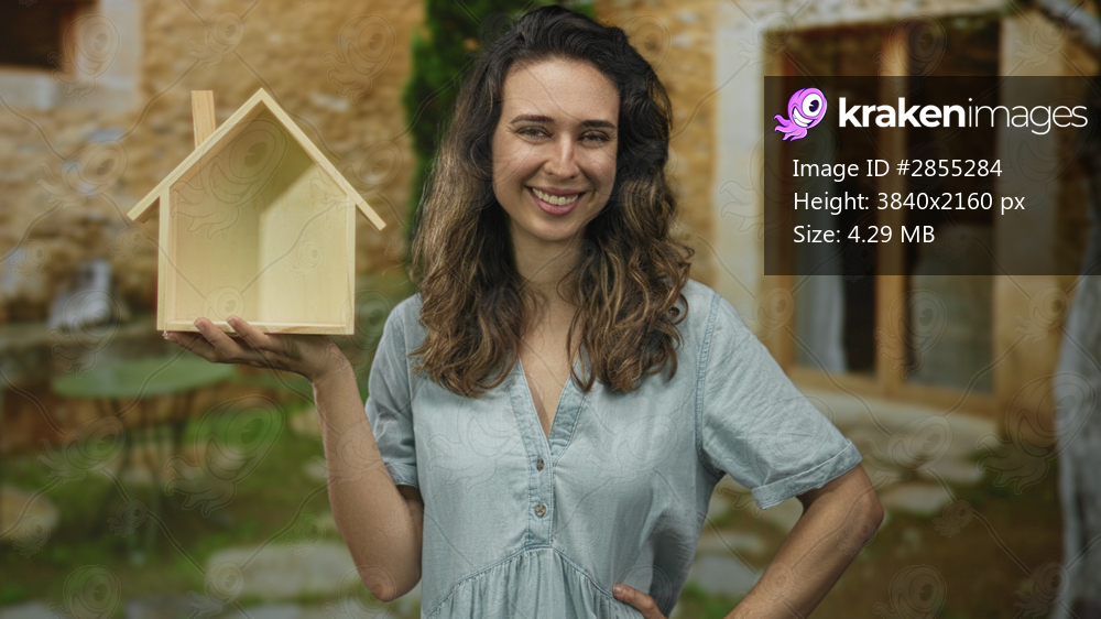 Woman holds wooden house model at home entrance while wearing denim dress and smiling warmly; optimism.