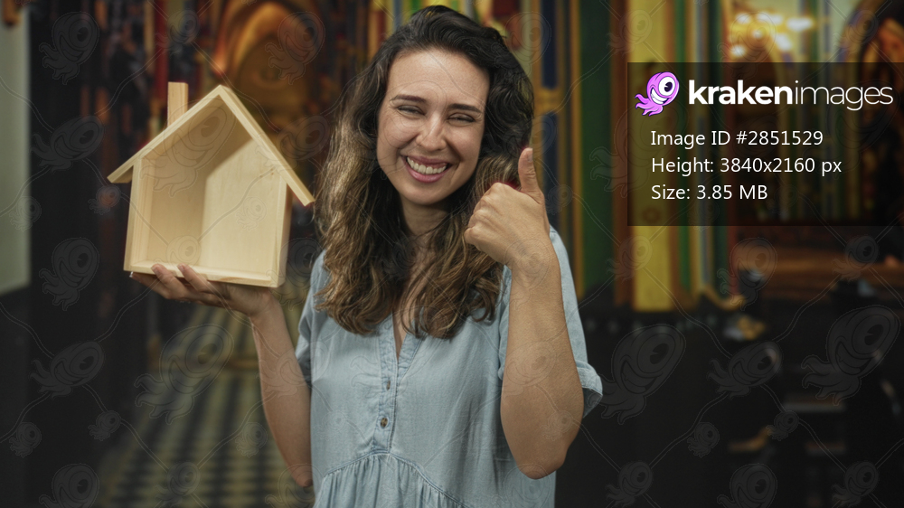 Woman holds wooden house model and gives thumbs up gesture in church building with colourful stained glass beyond; hope gratitude security.