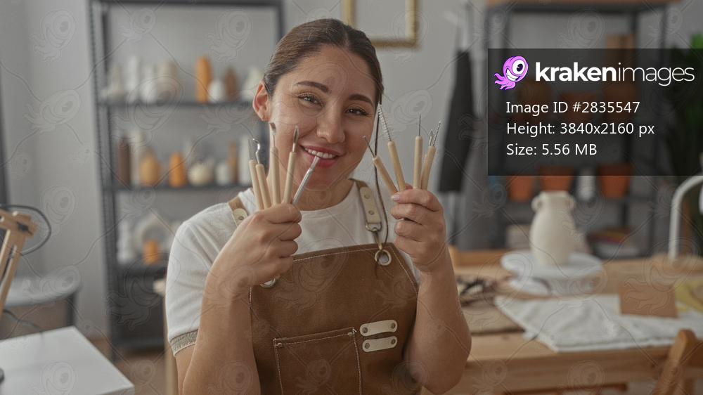 Woman holds wooden sculpting tools in her hands inside a studio workshop lined with clay vessels on shelves; artistic passion.