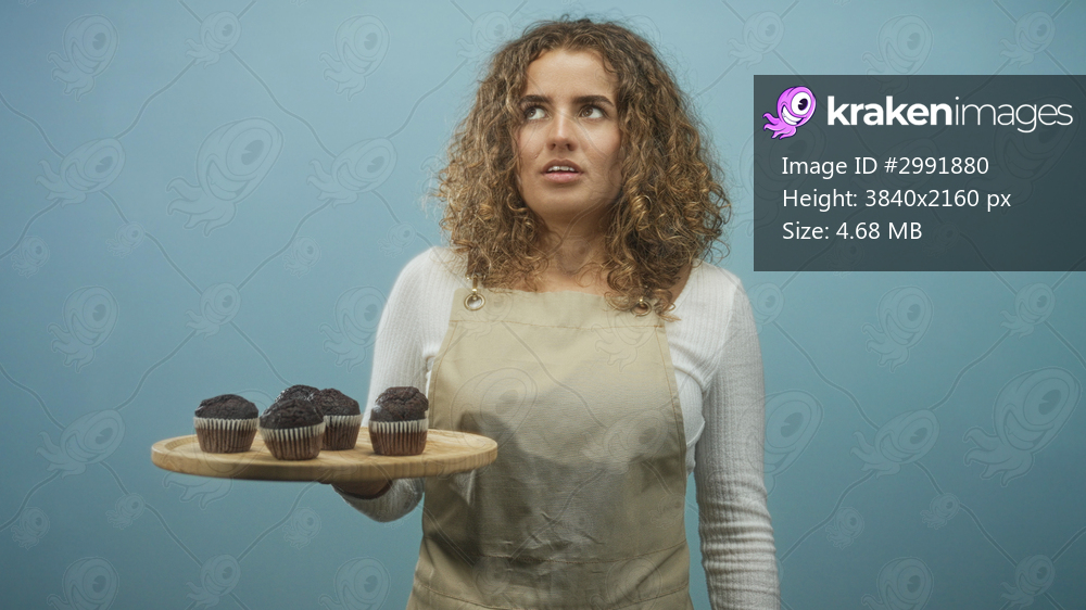 Woman holds wooden tray of chocolate muffins with hand extended while wearing apron in studio; homemade contentment.