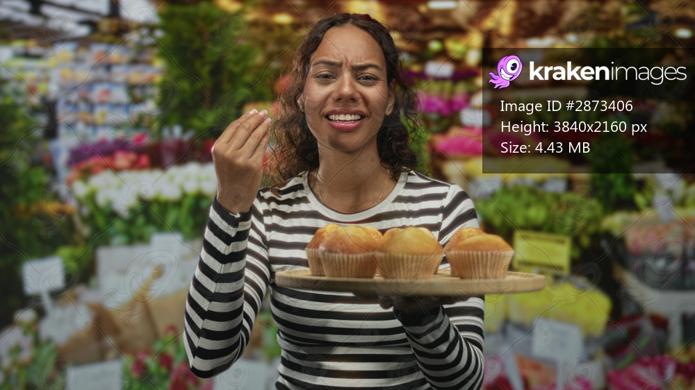 Woman holds wooden tray of muffins with pinched fingers gesture and raised hand in building flower shop aisle; frustration offering invitation.