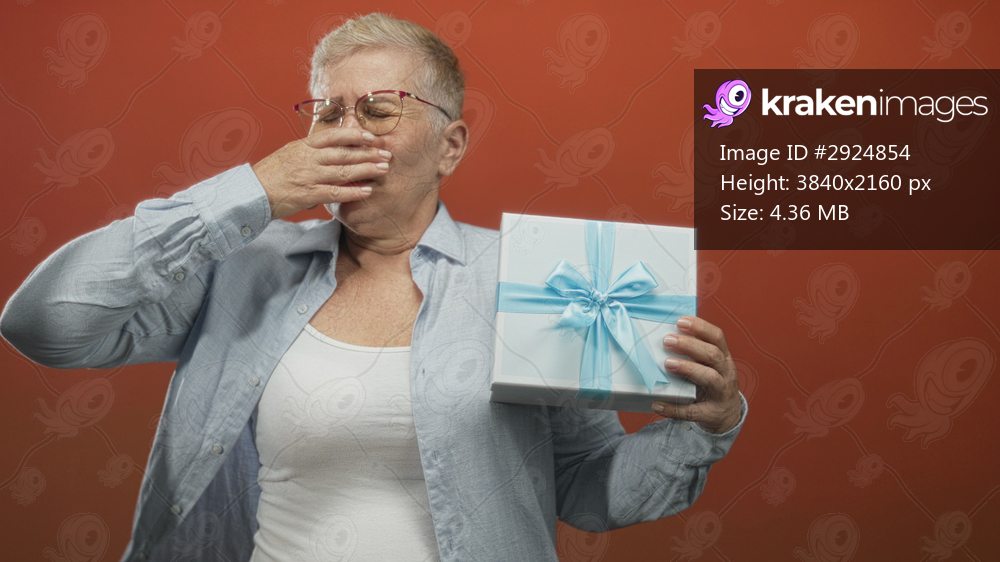 Woman holds wrapped gift box with blue ribbon and pinches her nose in a studio with orange backdrop; disgust reaction.