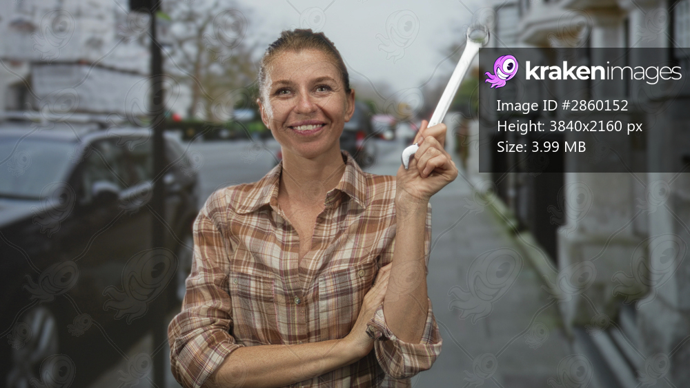 Woman holds wrench raised in right hand on street in front of parked car and stone building, plaid shirt with rolled sleeves, smiling with crossed arms; confidence independence. - Kraken Images