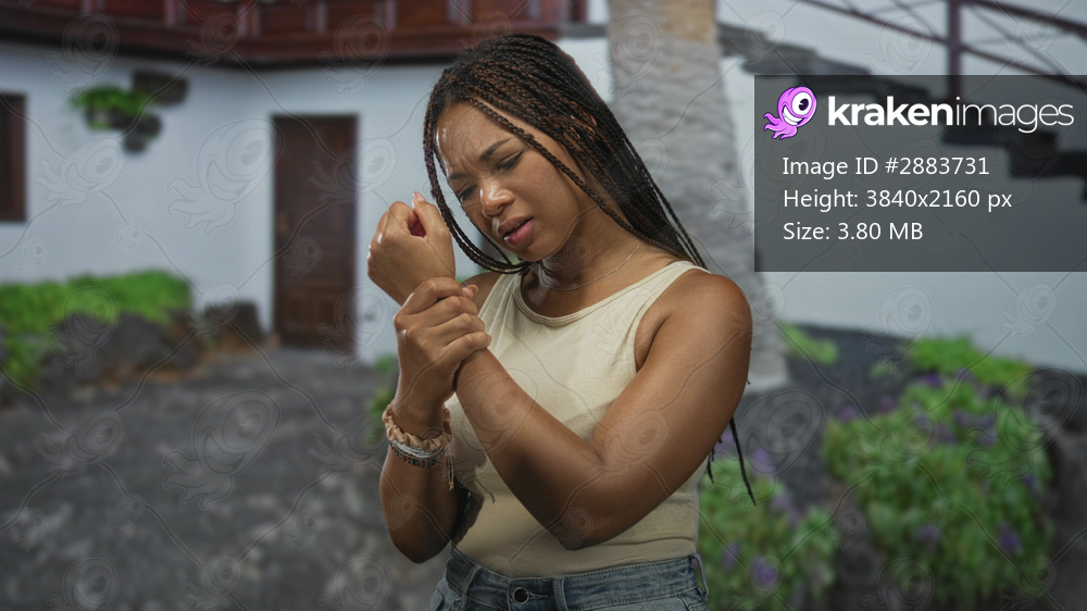 Woman holds wrist at building entrance, gripping her own wrist with eyes closed and head tilted back; pain healing resilience hope.
