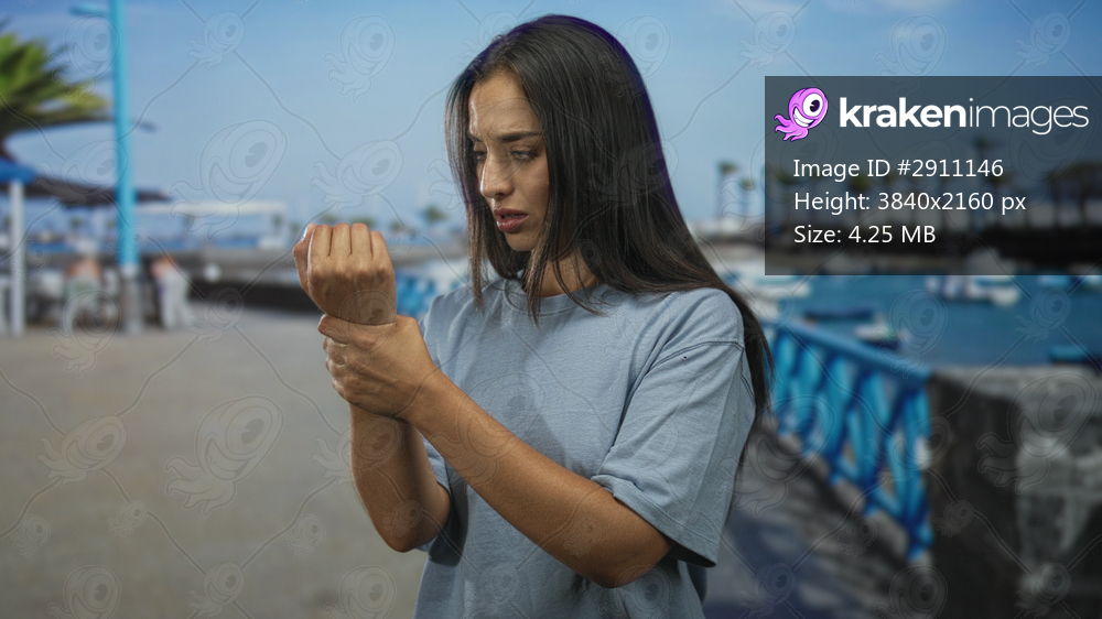 Woman holds wrist and winces on seaside street promenade beside a blue railing and moored boats, tense posture and visible discomfort; pain.