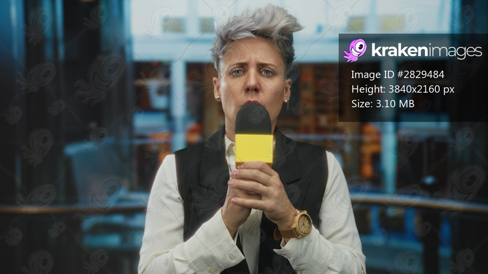 Woman holds yellow microphone with bare hand and speaks into it while facing camera in hotel building; confidence.