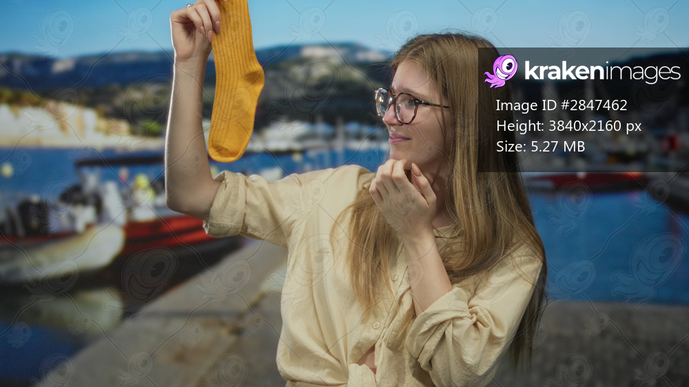 Woman holds yellow sock by boats and pinches nose at port pier; disgust hygiene caution discovery aversion.