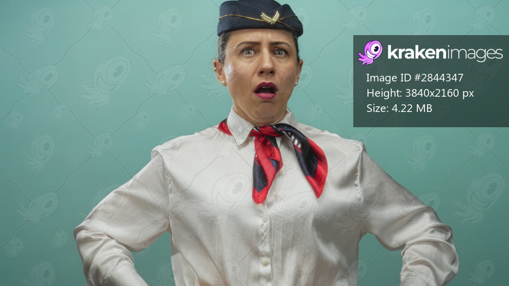 Woman hostess in flight attendant uniform stands with hands on hips and purses lips in green studio; annoyance.