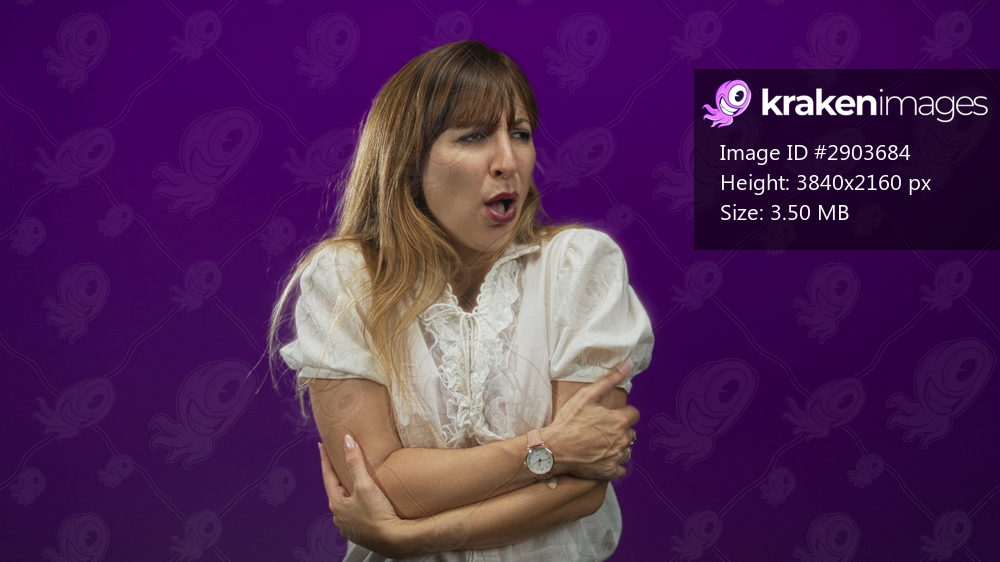 Woman hugging arms and shivering in studio with purple backdrop, clutching forearms and showing a tense grimace; cold discomfort.