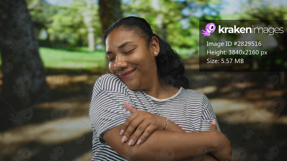 Woman hugging arms to chest in sunlit forest clearing with dappled foliage and fallen leaves; self acceptance serenity.