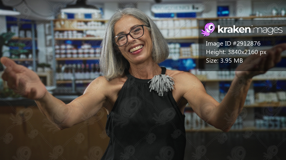Woman hugging bare arms in a pharmacy setting with shelves and counter in a building, smiling and wearing glasses; self care joy.