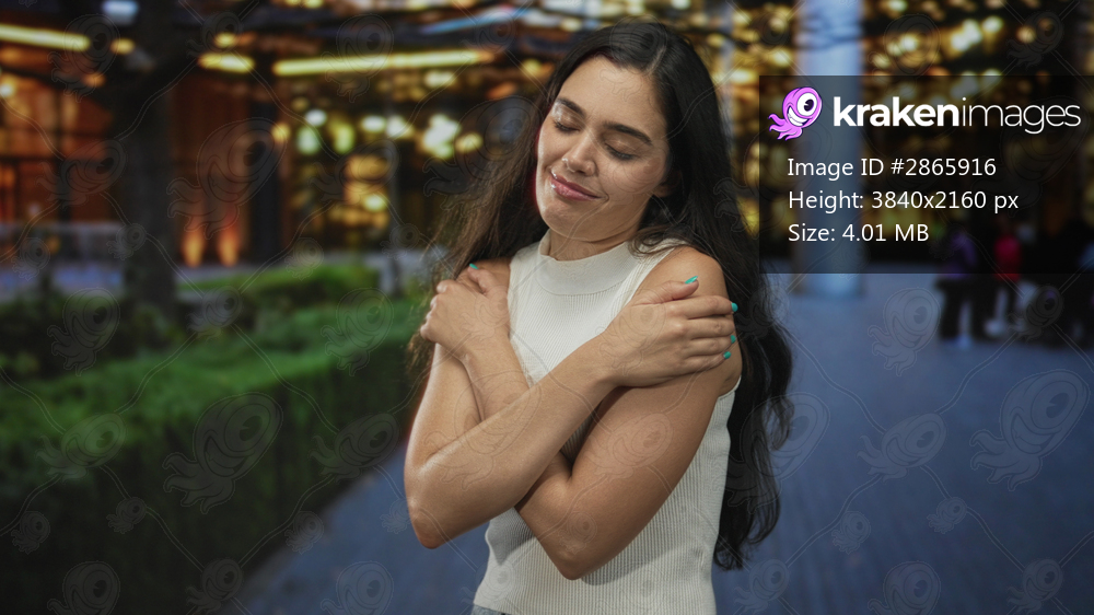 Woman hugging bare arms in sleeveless top on street under building lights at night; self care contentment.