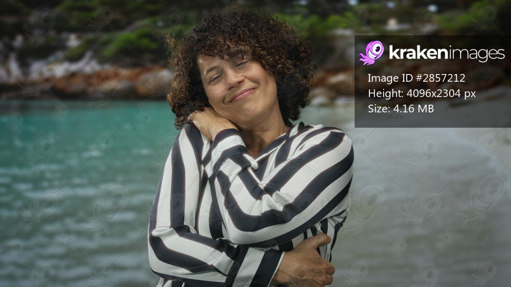 Woman hugging chest by turquoise water on beach in striped shirt; serenity reflection healing acceptance.