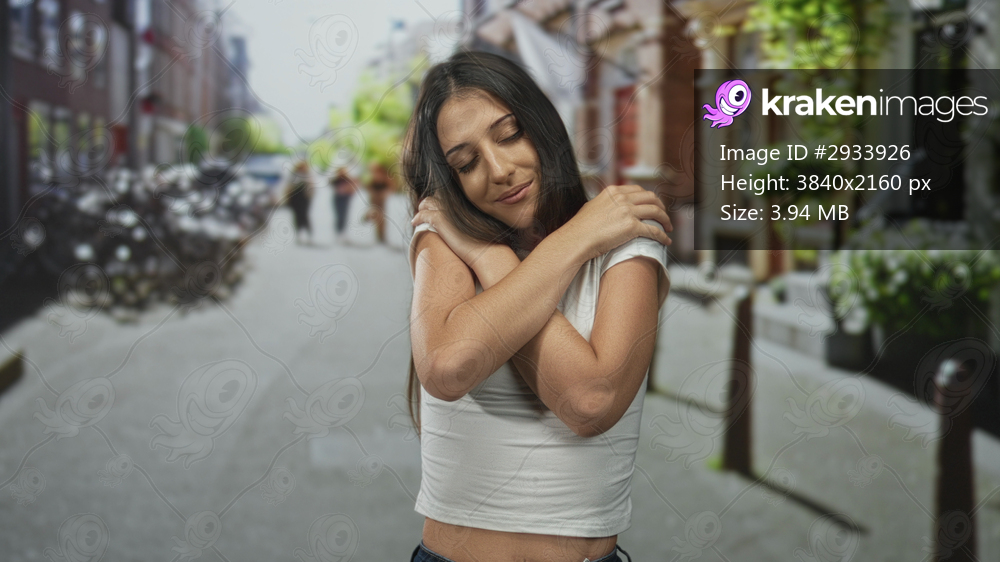 Woman hugging her arms across chest on a busy city street near bicycles and planters, smiling with closed eyes and relaxed posture; self care contentment. - Kraken Images
