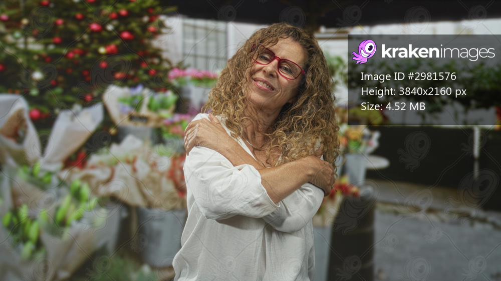 Woman hugging her arms amid a street flower market stall with bouquets, red glasses and white blouse; contentment.