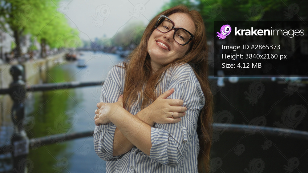 Woman hugging her arms by a canal railing on a street while wearing glasses, a striped shirt, and showing freckles; serenity.
