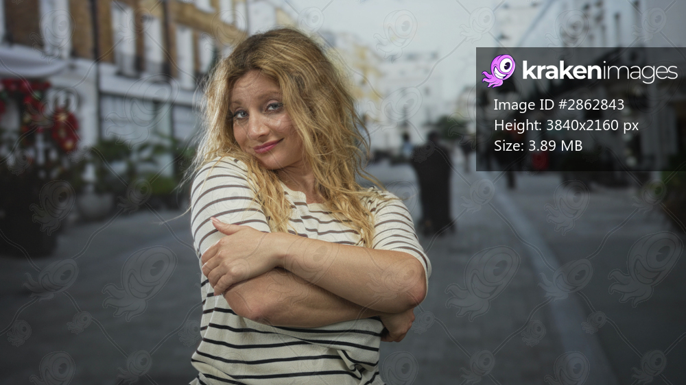Woman hugging her arms on a busy city street wearing a striped shirt and relaxed pose; playful confidence ease.