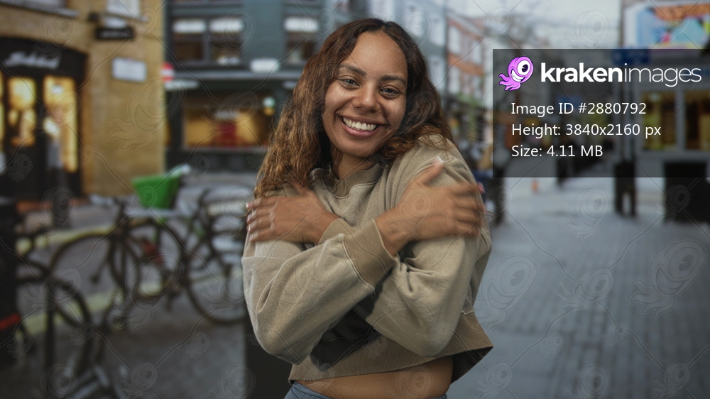 Woman hugging her arms and smiling on an urban street lined with shops and bicycles; happiness self care.