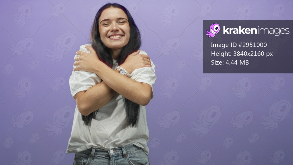 Woman hugging her arms, smiling toward camera in a studio with a purple backdrop, wearing a white tshirt and denim jeans; joy self love.