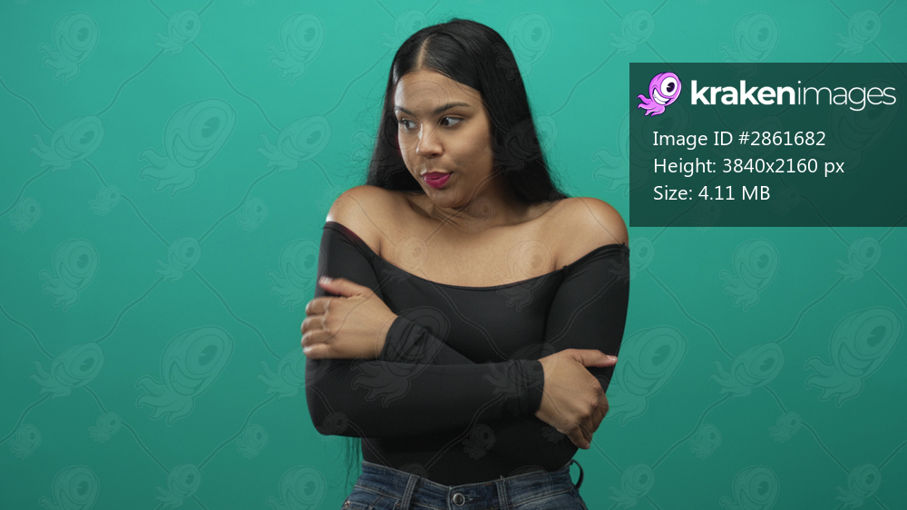 Woman hugging her bare shoulders in a green studio setting wearing off shoulder top and jeans; vulnerability selfcare.