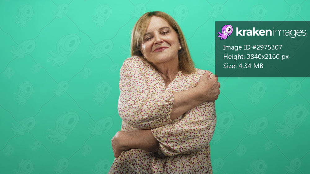 Woman hugging her shoulders with bare hands and smiling in a studio against a teal backdrop, arms crossed in self embrace; contentment.