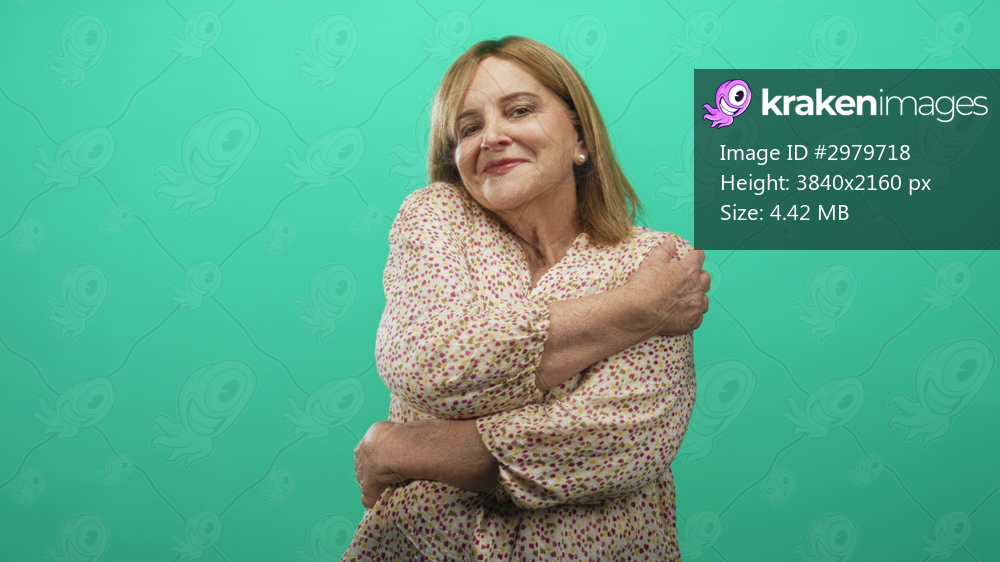 Woman hugging her shoulders with bare hands and smiling in a studio against a teal backdrop, arms crossed in self embrace; contentment.