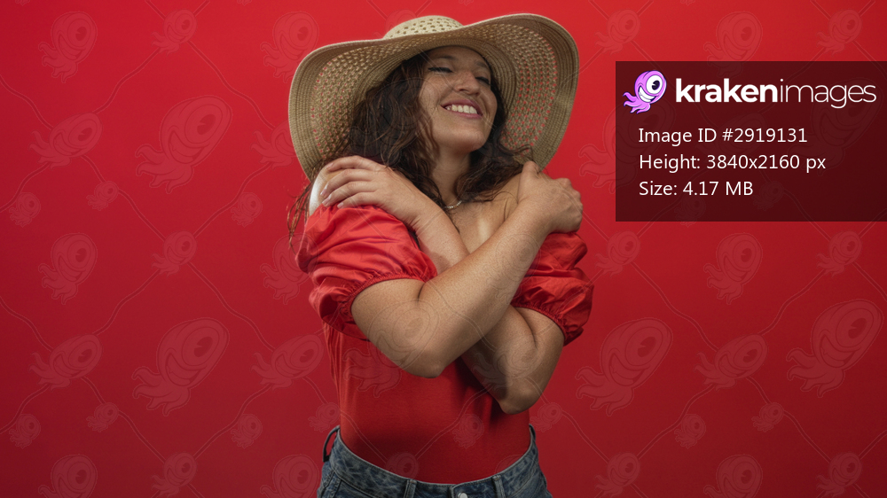 Woman hugging herself with arms crossed showing bare shoulders in a red studio; self love confidence joy.