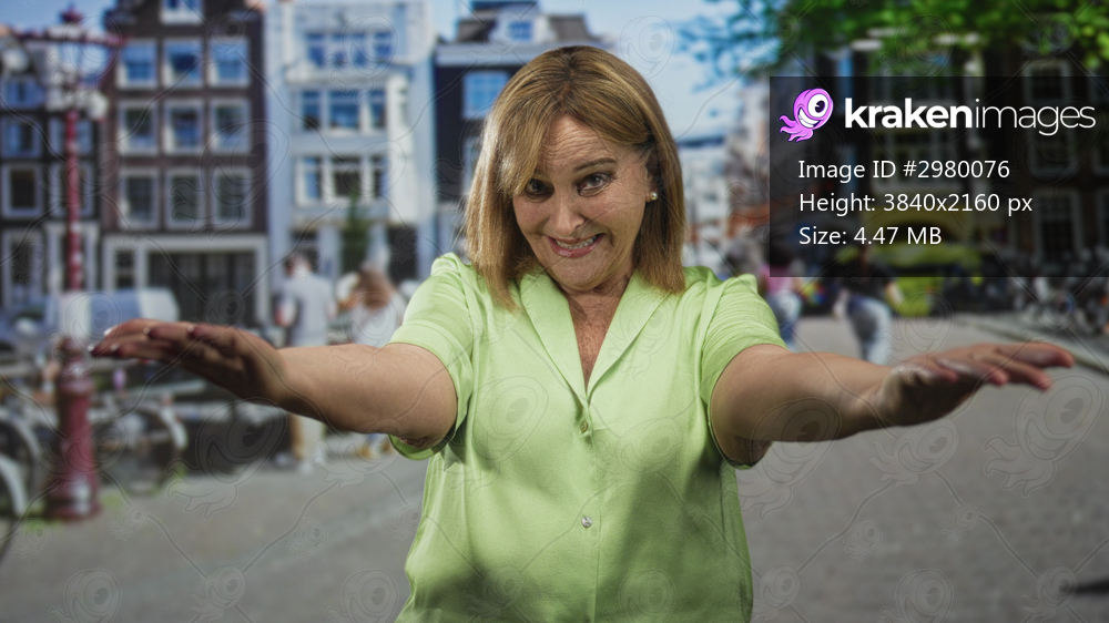 Woman hugging herself with arms crossed, smiling with eyes closed, standing on a cobbled street among canal buildings and bicycles; comfort serenity.