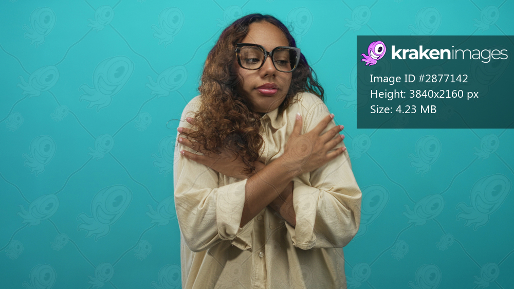 Woman hugging herself with arms crossed, wearing beige shirt and glasses in studio teal backdrop; nervousness vulnerability.