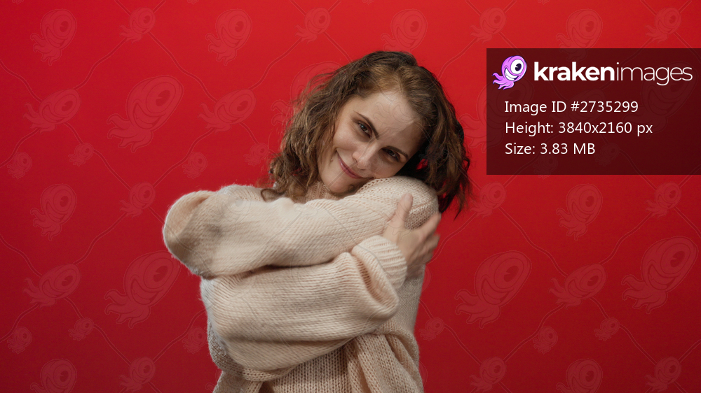 Woman hugging herself with eyes closed in a cozy sweater against a bright red background, expressing warmth, comfort, and emotional self-care through her gentle embrace. - Kraken Images