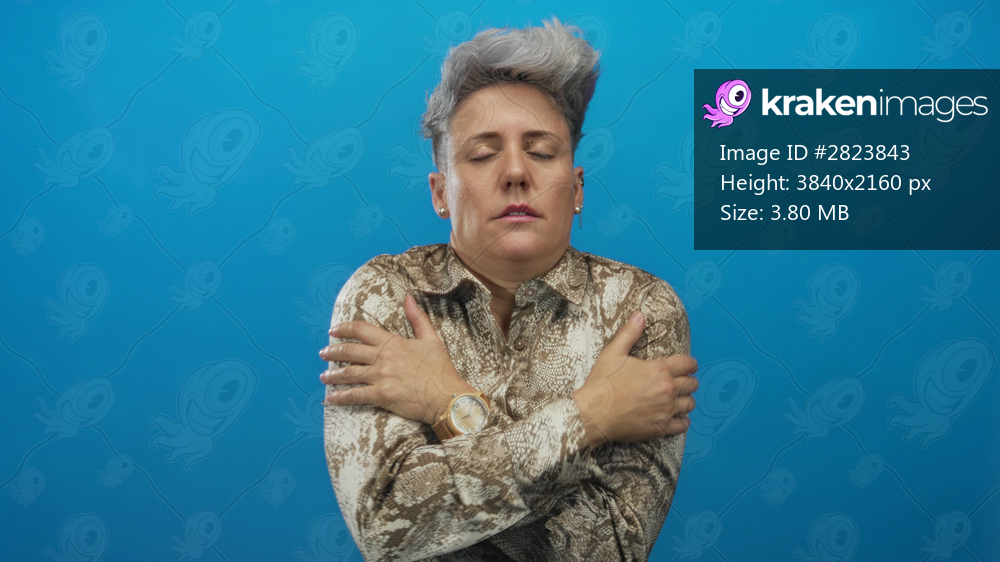 Woman hugging herself with eyes closed and shivering in blue studio portrait wearing snakeskin shirt; discomfort cold vulnerability isolation.