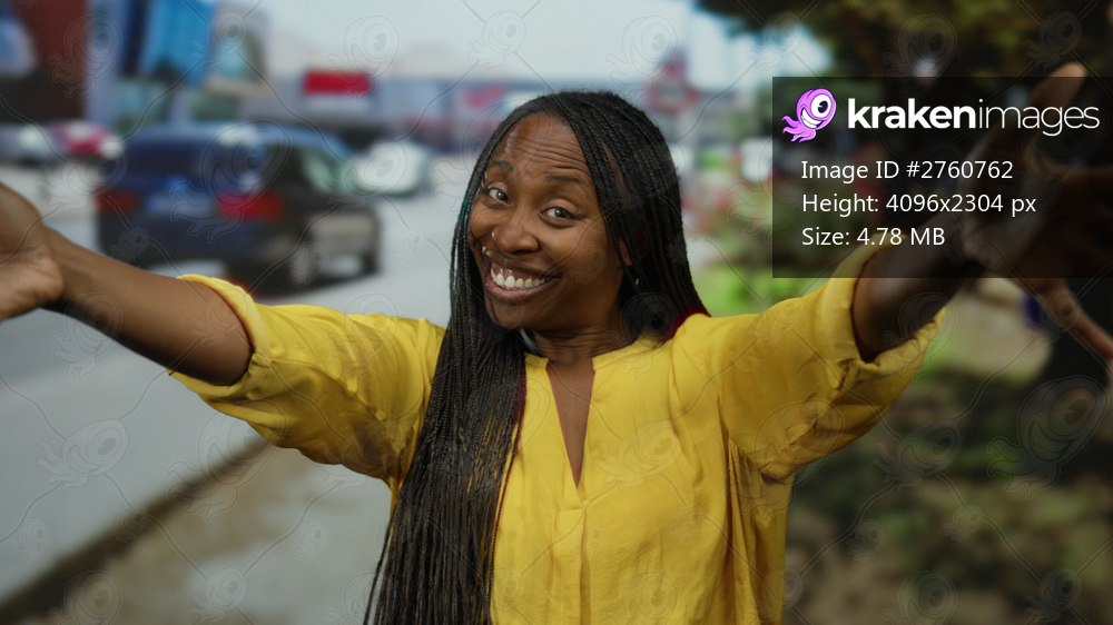 Woman hugging herself joyfully on a city street, capturing the essence of urban life with her bright yellow attire and relaxed demeanor.