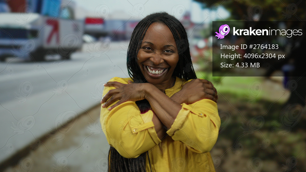 Woman hugging herself joyfully on a city street, capturing the essence of urban life with her bright yellow attire and relaxed demeanor.