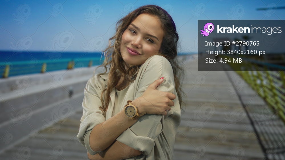 Woman hugging herself wearing a watch while standing on a wooden seaside promenade under bright daylight; self care calm serenity.