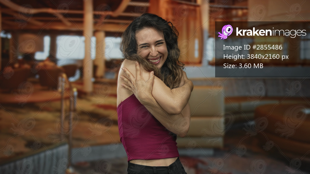 Woman hugging shoulders with crossed arms while smiling softly in restaurant building; self care joy.