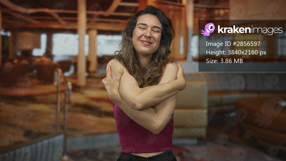 Woman hugging shoulders with crossed arms while smiling softly in restaurant building; self care joy.