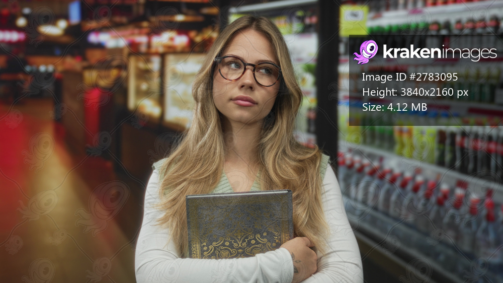 Woman hugs book with arms while quietly standing in restaurant aisle; contemplation curiosity anticipation.