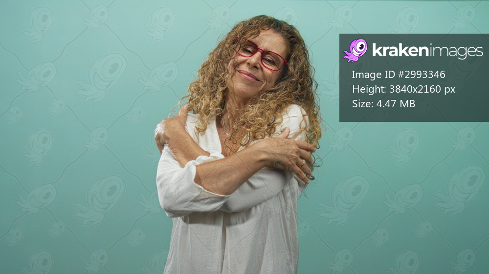 Woman hugs her shoulders and smiles, wearing red glasses and a white blouse against a studio backdrop; self love contentment.