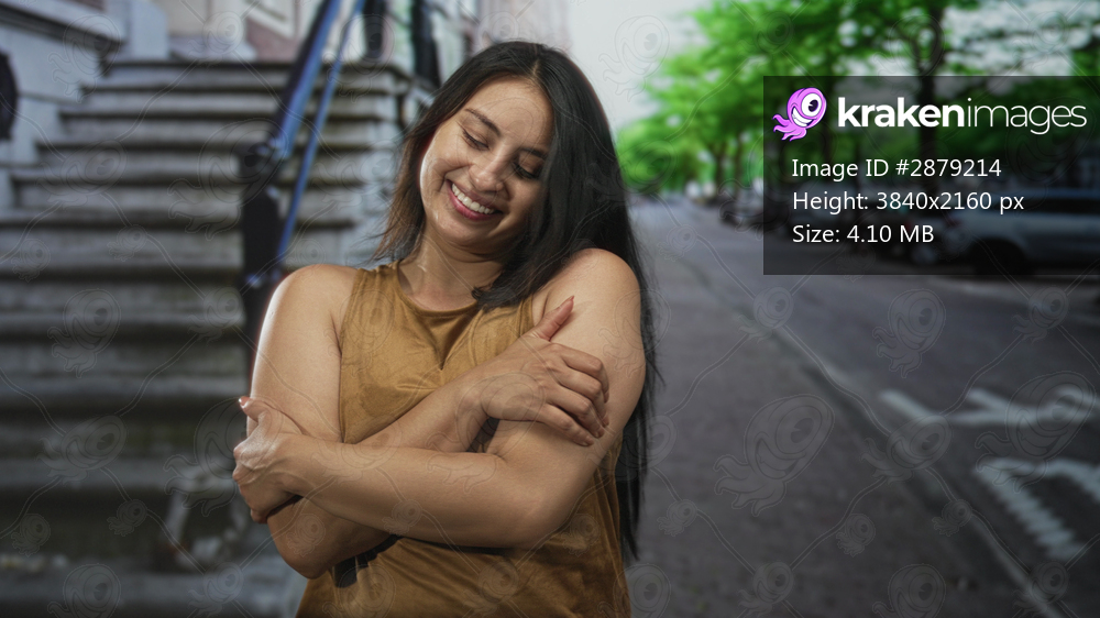 Woman hugs herself with bare arms on a city street by stone stairs, smiling in a casual pose and closing eyes; self care joy.